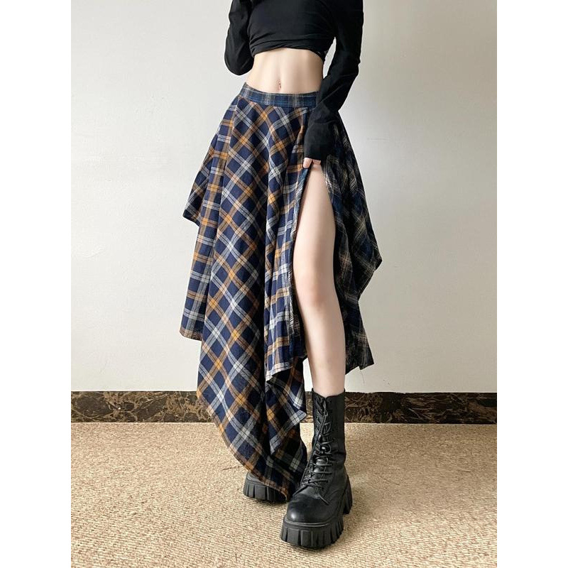 クロスボーダー レディース パッチワーク チェック柄 プリント スプリット サイ A ライン スカート