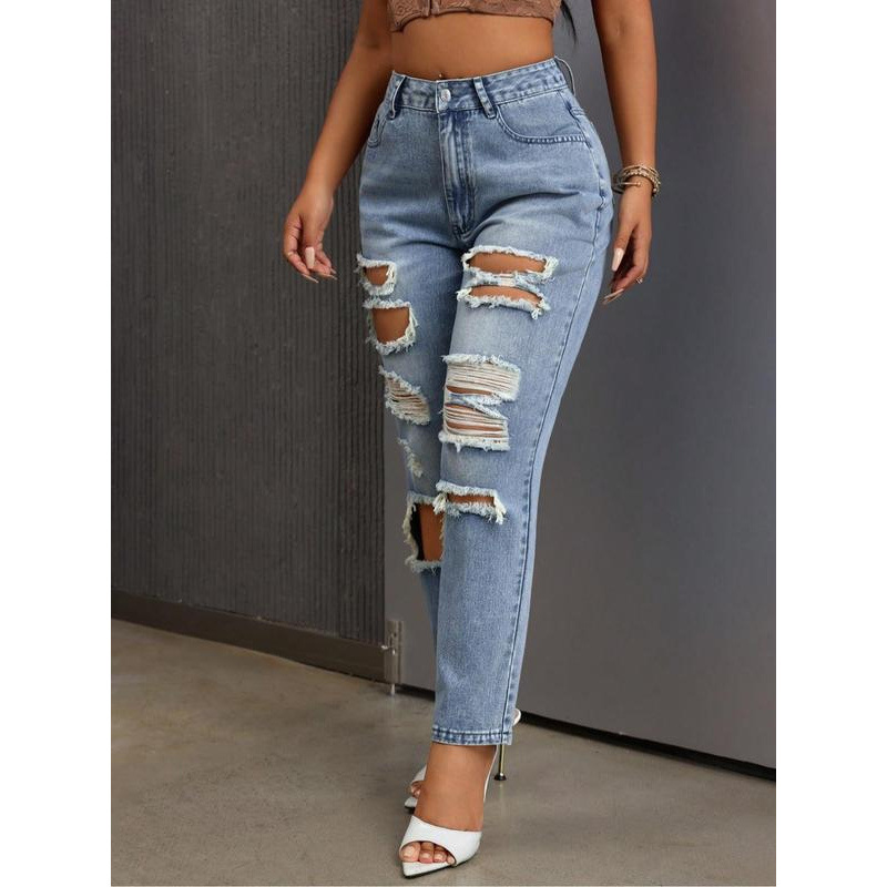 レディース プレーン リップド ボタン フライ デニム ジーンズ ファッション カジュアル