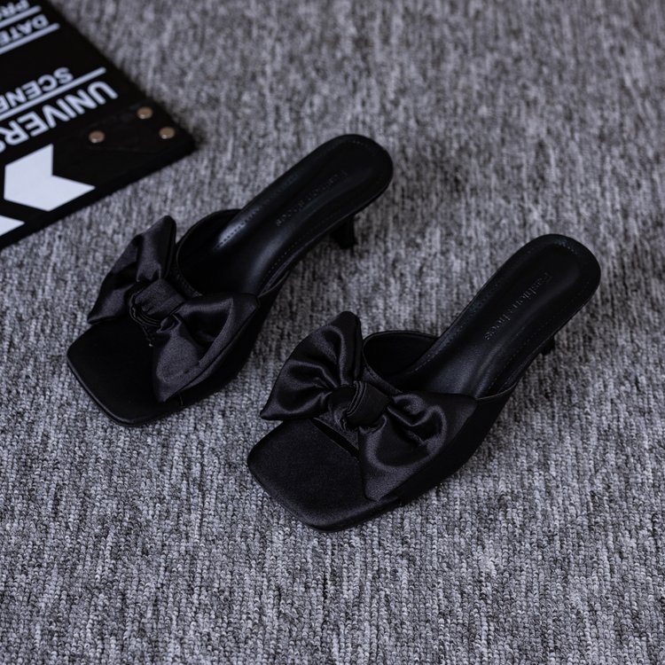 2024年夏の新型蝶結びのサテンのハイヒールの女性のセクシーなドリルの細いかかとの露指の冷たいスリッパの黒いピンク
