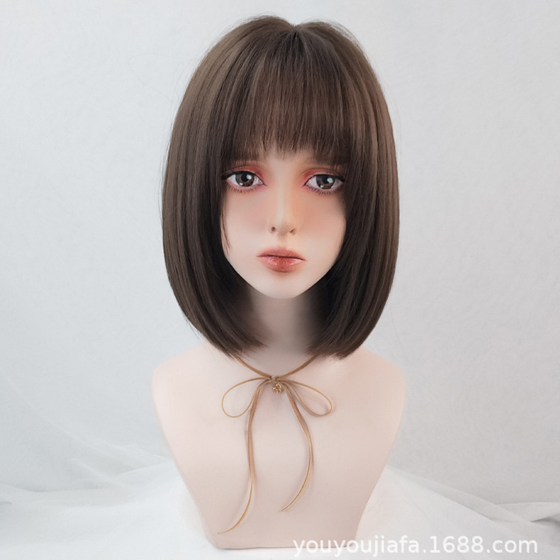 かつらの女性のショートヘアの韓国式boboの頭のかわいい漫画の前髪の丸い顔の少女の鎖骨の髪の全頭カバーの波の頭カバー