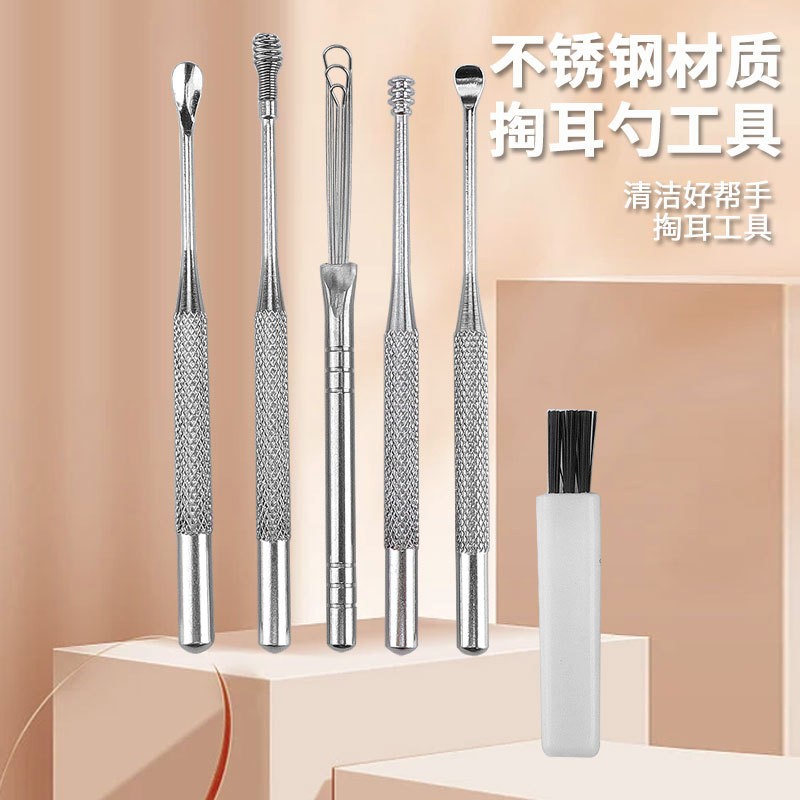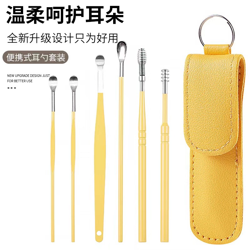 メーカーの現物の皮カバーの耳掘り6セットのステンレスの耳抜きスプーンのスプリングの耳のスプーンは耳の糞を取り出して携帯して耳の道具を採取します。