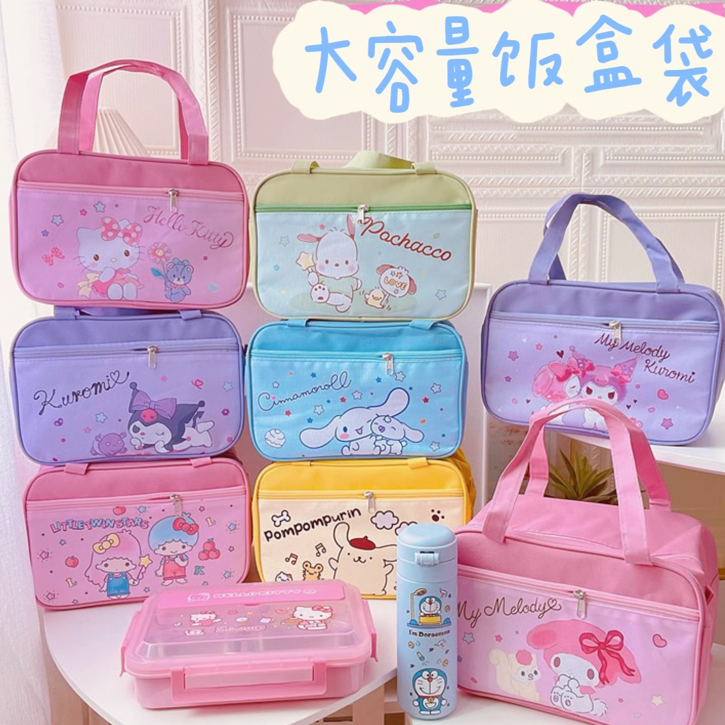 かわいい漫画スタイルのアルミ箔内層二層ポータブル断熱バッグ大容量学生オフィスワーカー弁当箱バッグ