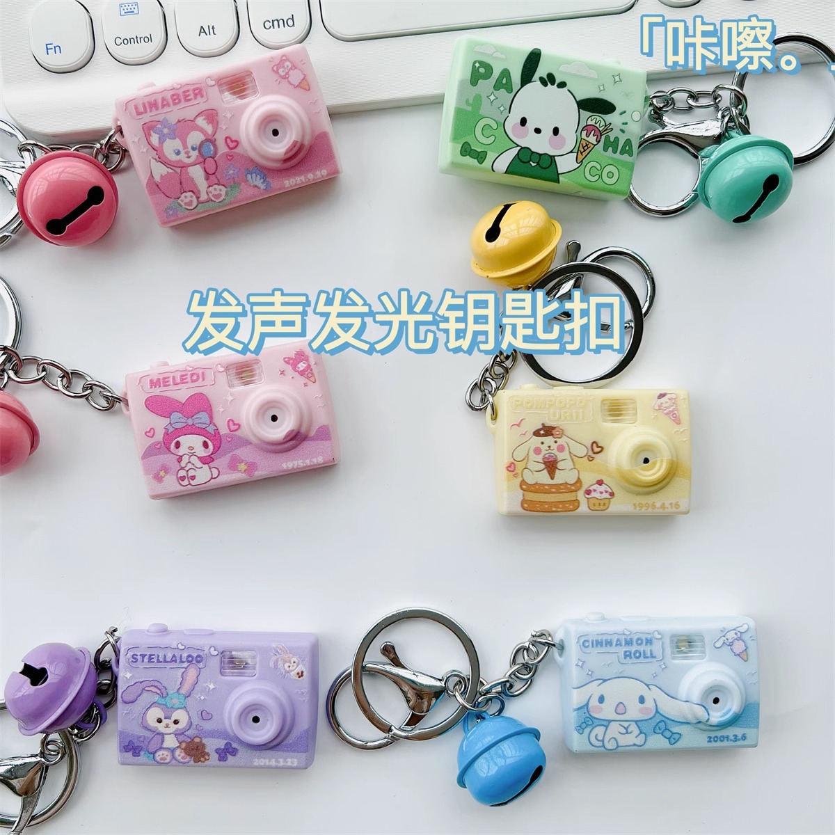 アニメの音が光るミニシミュレーションカメラのキーホルダーに玉桂犬の学生カバンに飾られたおもちゃの子供がいます。