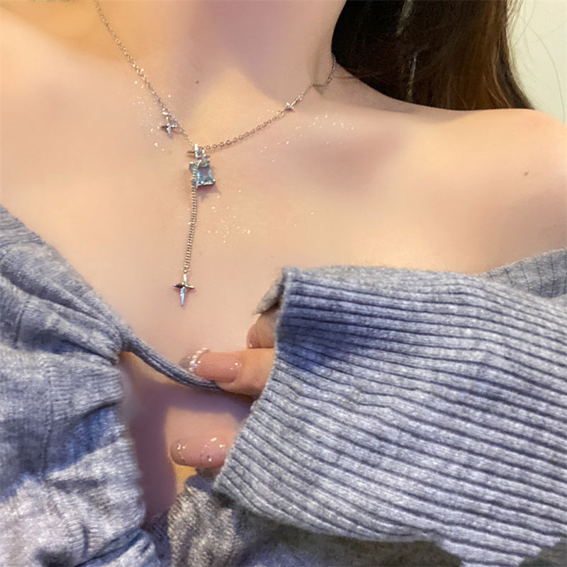 夢幻アイスランドブルー角糖ジルコンネックレス女性流蘇四星芒デザイン感小衆夏限定鎖骨鎖