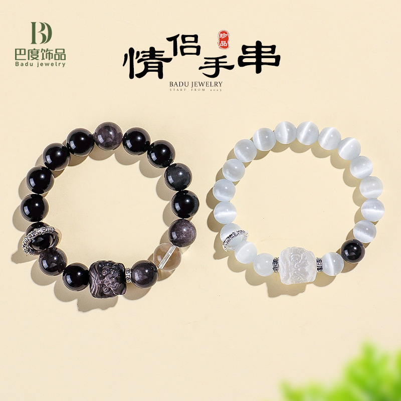 シルバー黒曜石キャッツアイライオン覚醒ビーズカップルブレスレット女性のオリジナルデザイン乾坤サークルホワイトクリスタルブレスレットジュエリー