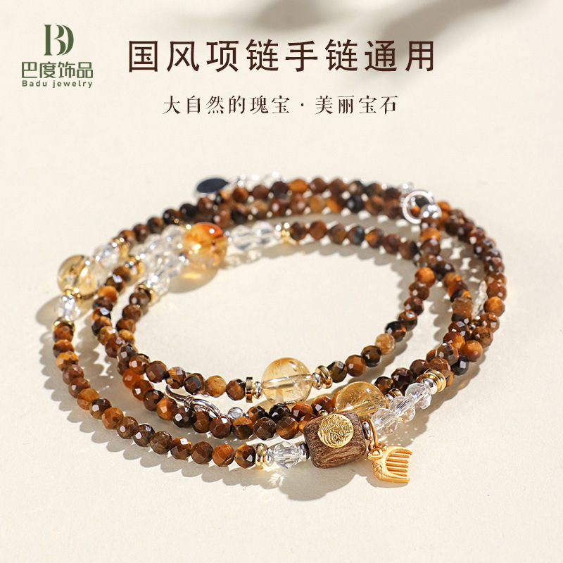 3mm切断面虎眼石ブレスレットネックレス女性通用沈香木黄塔水晶文芸復古手串アクセサリー