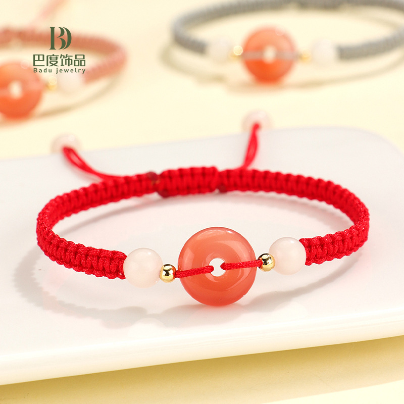 新商品の桜瑪瑙白菩提紅縄平安バックルブレスレット女性大衆高級感手編み手縄手串