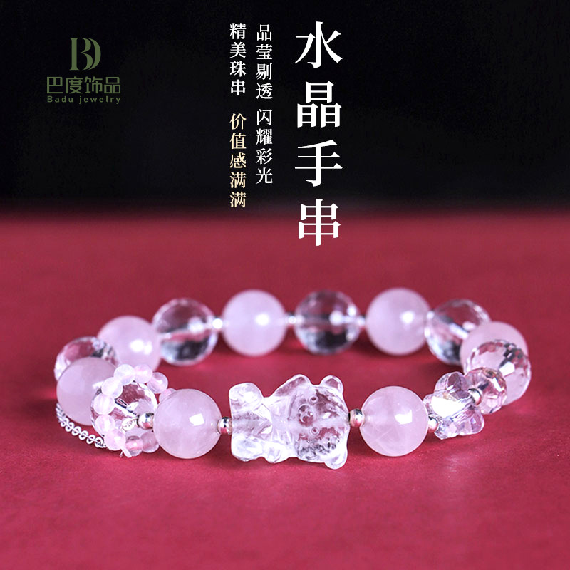 新商品の白水晶の熊の数珠のブレスレットの女性の百合の小さい大衆の高級感の天然のピンクの水晶の手は卸売りを飾ります。