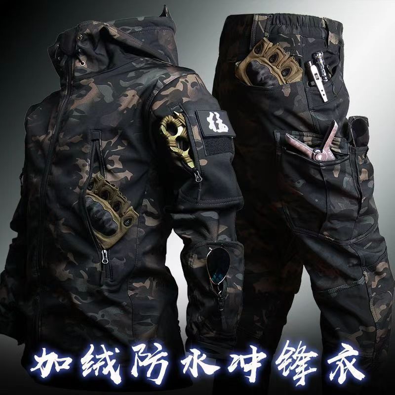 アウトドア戦術サメ皮突撃服セット男性ベルベット迷彩コート工装帽子冬騎行作業服