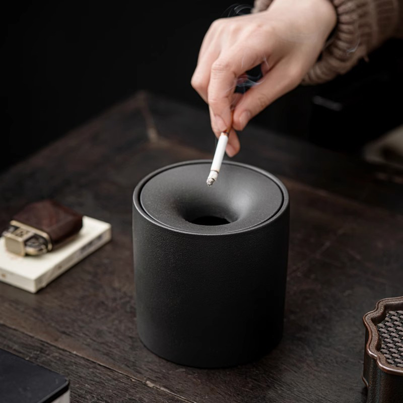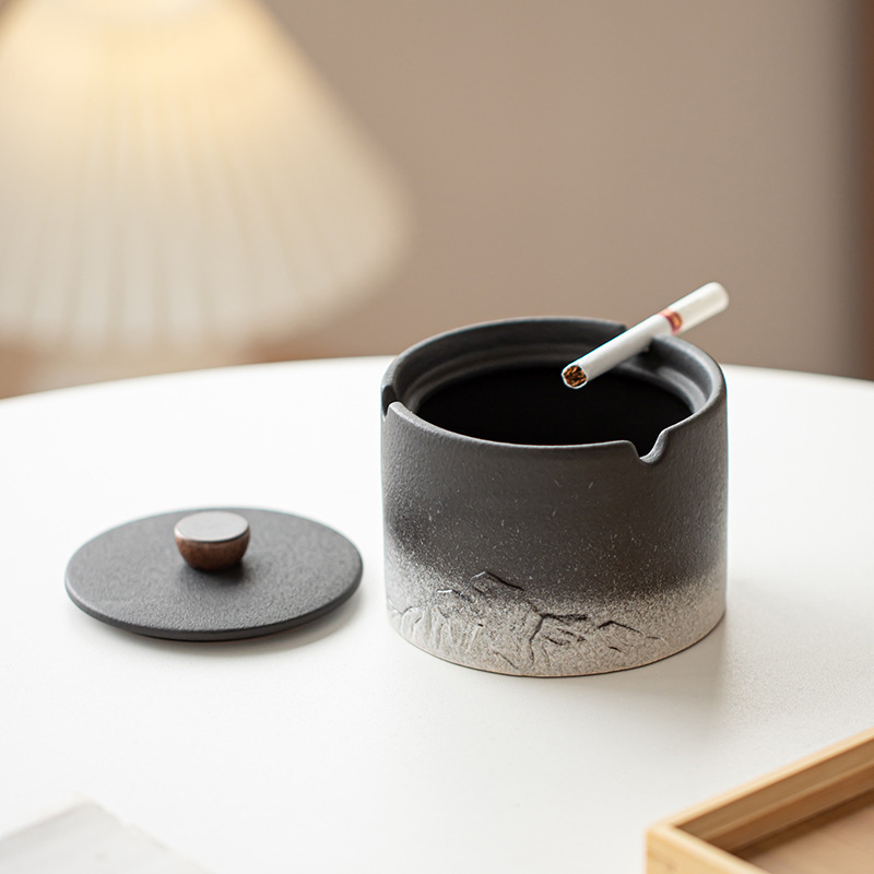灰皿 黒陶 クリエイティブセラミック 煙壺 ホテル ホーム リビングルーム 茶卓 防風 蓋付き 煙皿 禅意