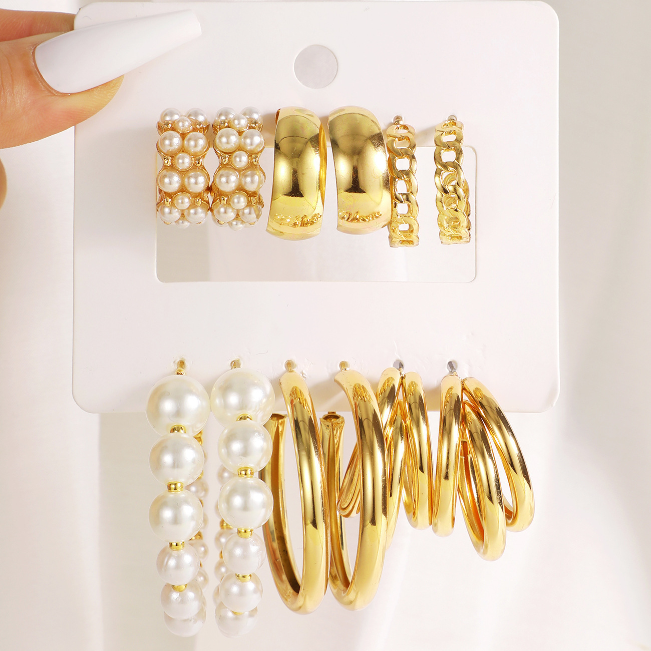 越境新型創意レトロ真珠イヤリング女性欧米個性金属円チェーンピアスセット6点セット