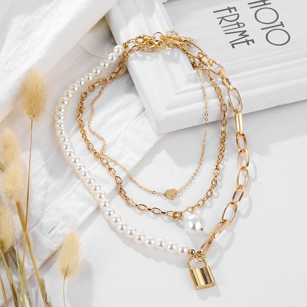 ヨーロッパとアメリカの誇張された非対称ネックレスジュエリーレトロ多用途多層チェーンピーチハートバロックパールネックレス