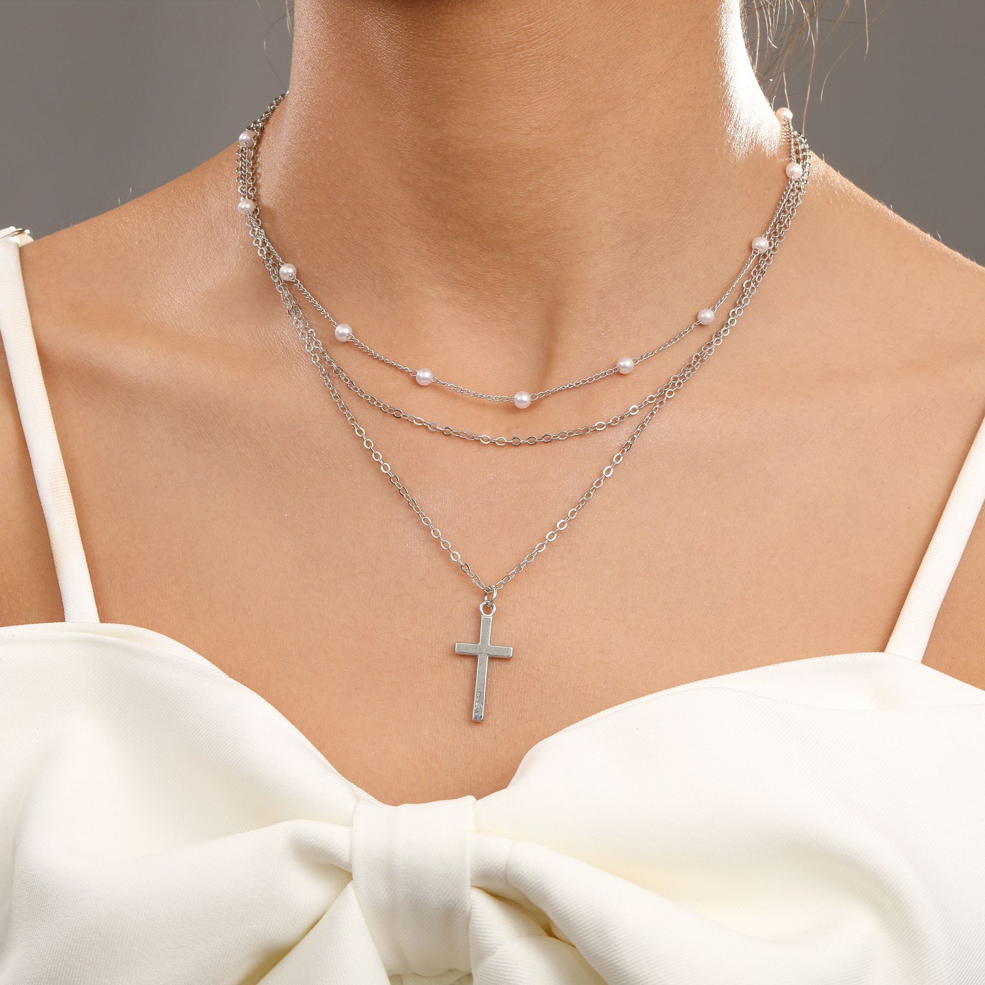 欧米のクロスボーダー新型創意シンプル気質女性真珠クロスネックレス3点セット白K