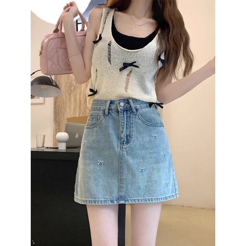 ライトカラーハイウエストデニムスカート女性の夏のリボン刺繍 A ラインスカートヒップカバースカートハーフスカート 2025 新しいスタイル