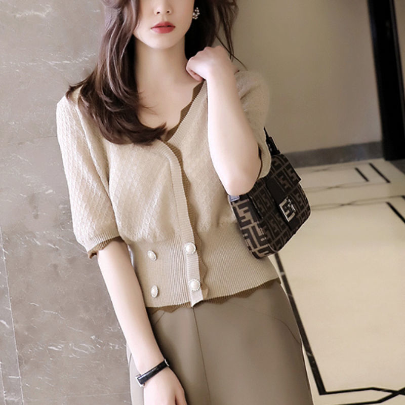 波状エッジアイスシルクミッドスリーブエレガントなアウターウェア半袖女性のための 2025 新しいスリム夏薄いニットセータートップ女性のための