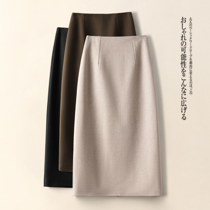 ウールのAラインスカート、エレガントな女性の2025秋冬の新しいハイウエストスリムで多用途なスリット付きミドル丈ソリッドカラースカート