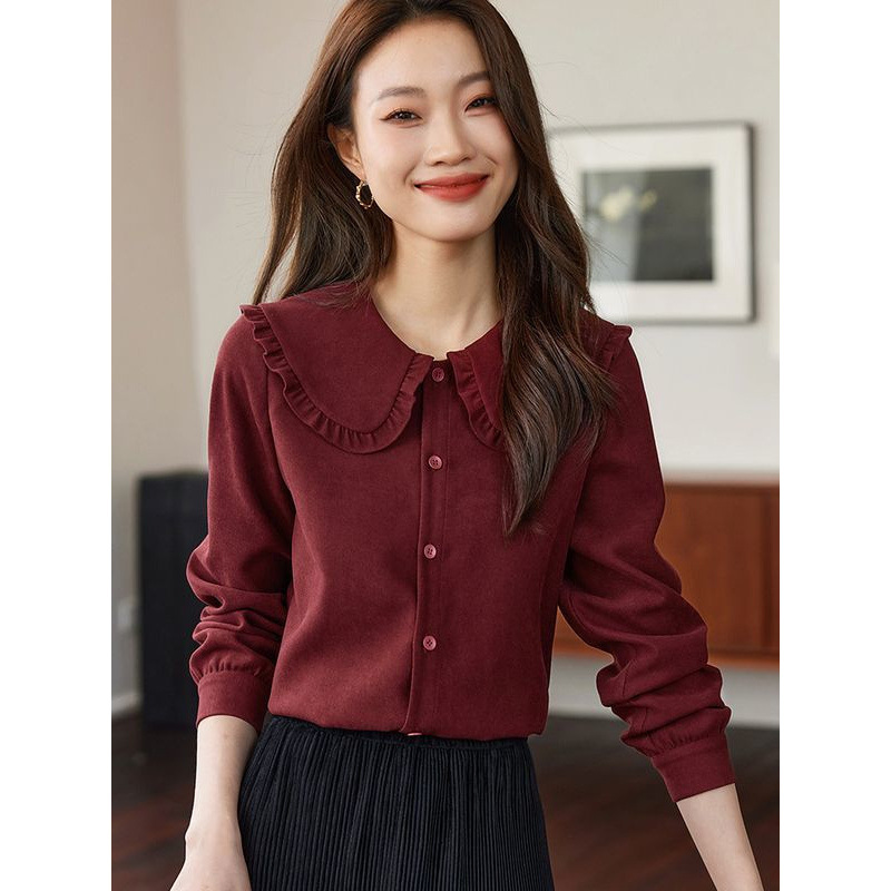 秋の女性用レトロドールカラーシャツ、厚みのある起毛フレンチシャツ、デザインと気質、小柄な人向けの長袖トップス
