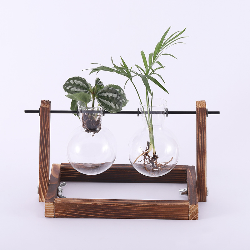 メーカー直供デスクトップ創意木架水培球形穿孔ガラス花瓶植物花瓶容器事務室