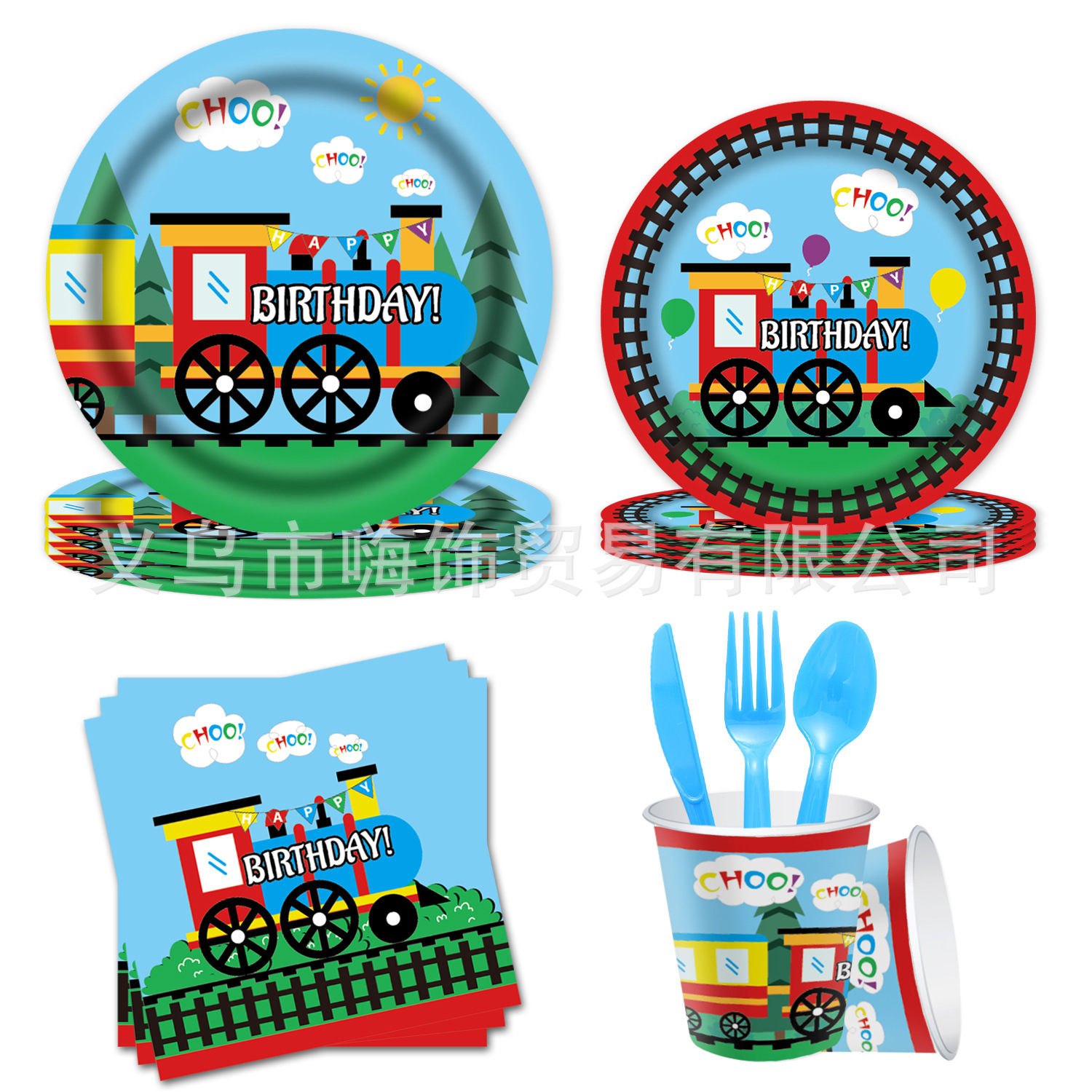 国境を越えたアニメ列車をテーマにした使い捨て紙皿ペーパータオル紙コップテーブルクロスは旗を引いて子供の誕生日パーティーを飾る