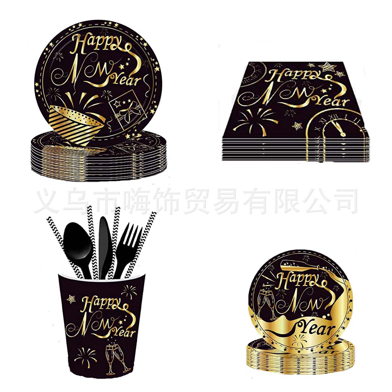 2024年ハッピーニューイヤー使い捨て黒金食器ティッシュペーパートレイフラッグテーブルクロス新年パーティー用