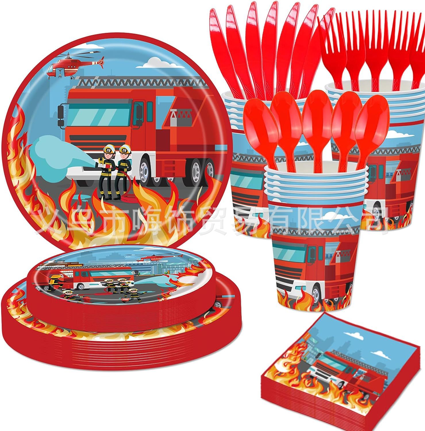 消防車をテーマにした使い捨て紙皿ペーパータオル紙コップテーブルクロスは旗を引いて子供の誕生日パーティーの雰囲気を飾っている