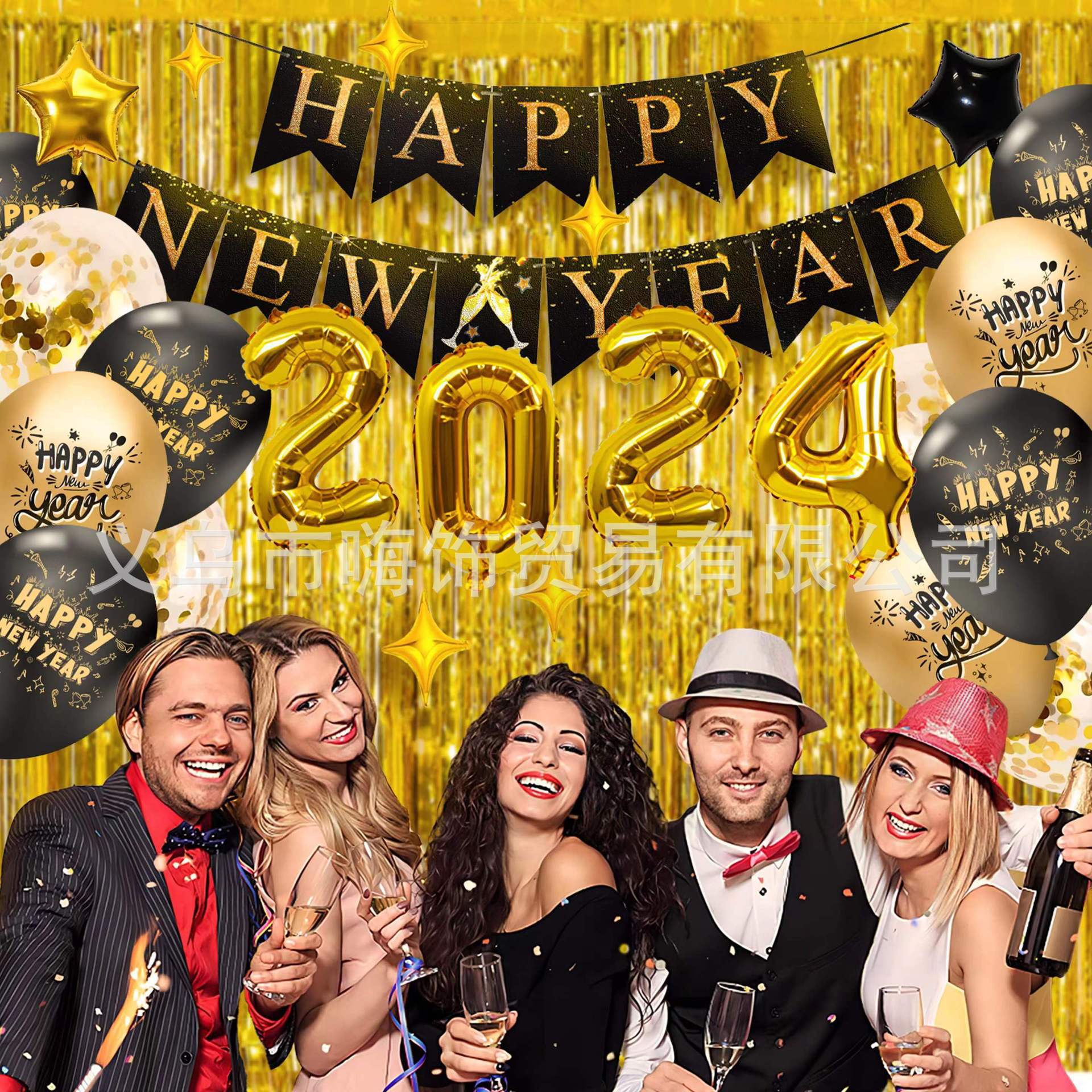 2024年新年黒金風船18インチ32インチアルミ膜風船金色雨糸カーテン新年パーティーセット装飾