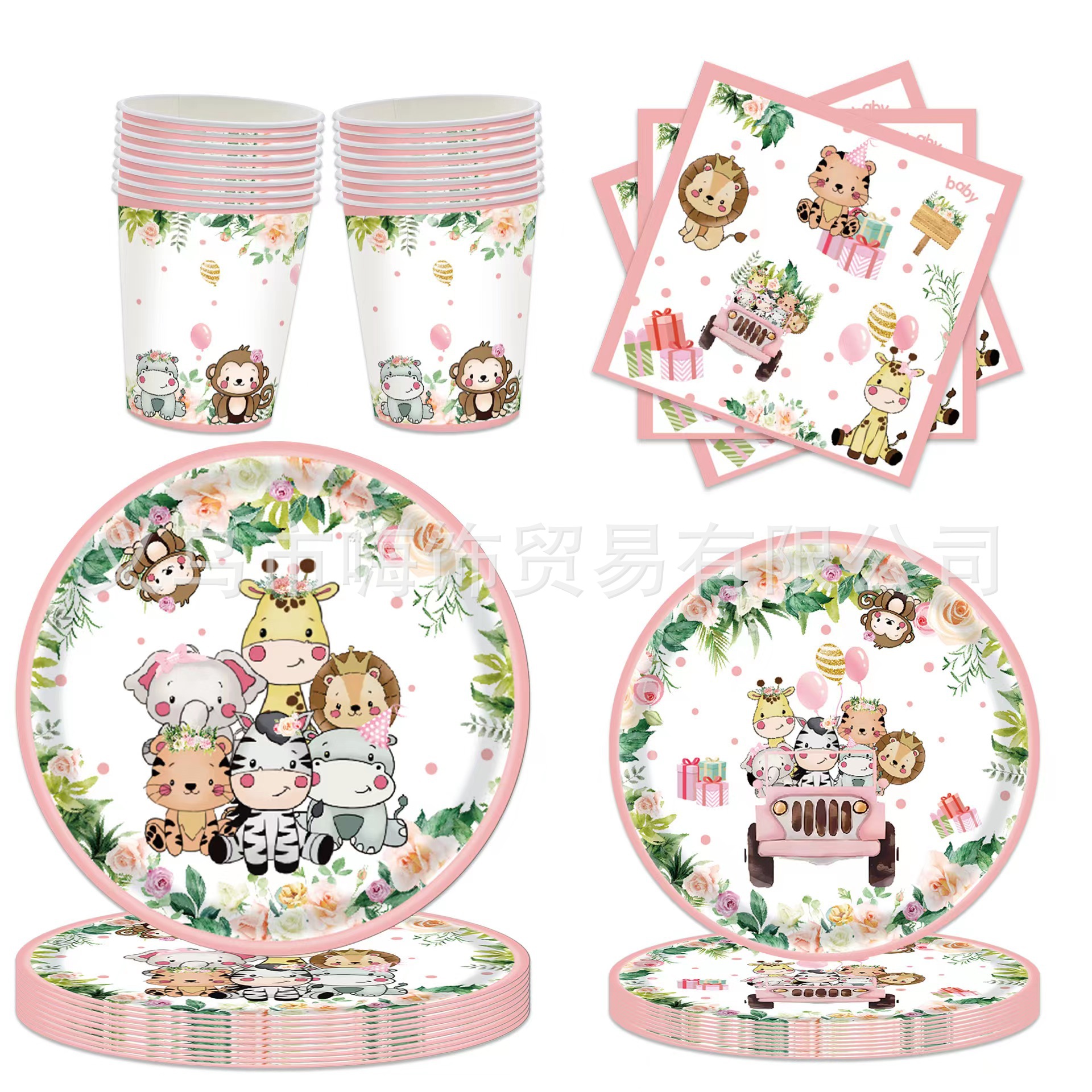 国境を越えたジャングル動物園の子供の誕生日食器パーティーピンクのジャングル動物セット紙皿ティッシュテーブルクロス