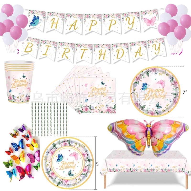 クロスボーダー新作春日蝶花パーティー紙コップ紙皿ナイフフォークスプーンテーブルクロスバナー誕生日飾り