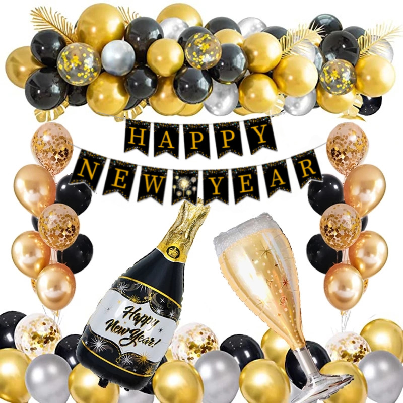 2023新年のテーマ黒金新年のワインボトルの杯の旗の32インチのアルミニウム膜の風船の新年のパーティーのセットの装飾