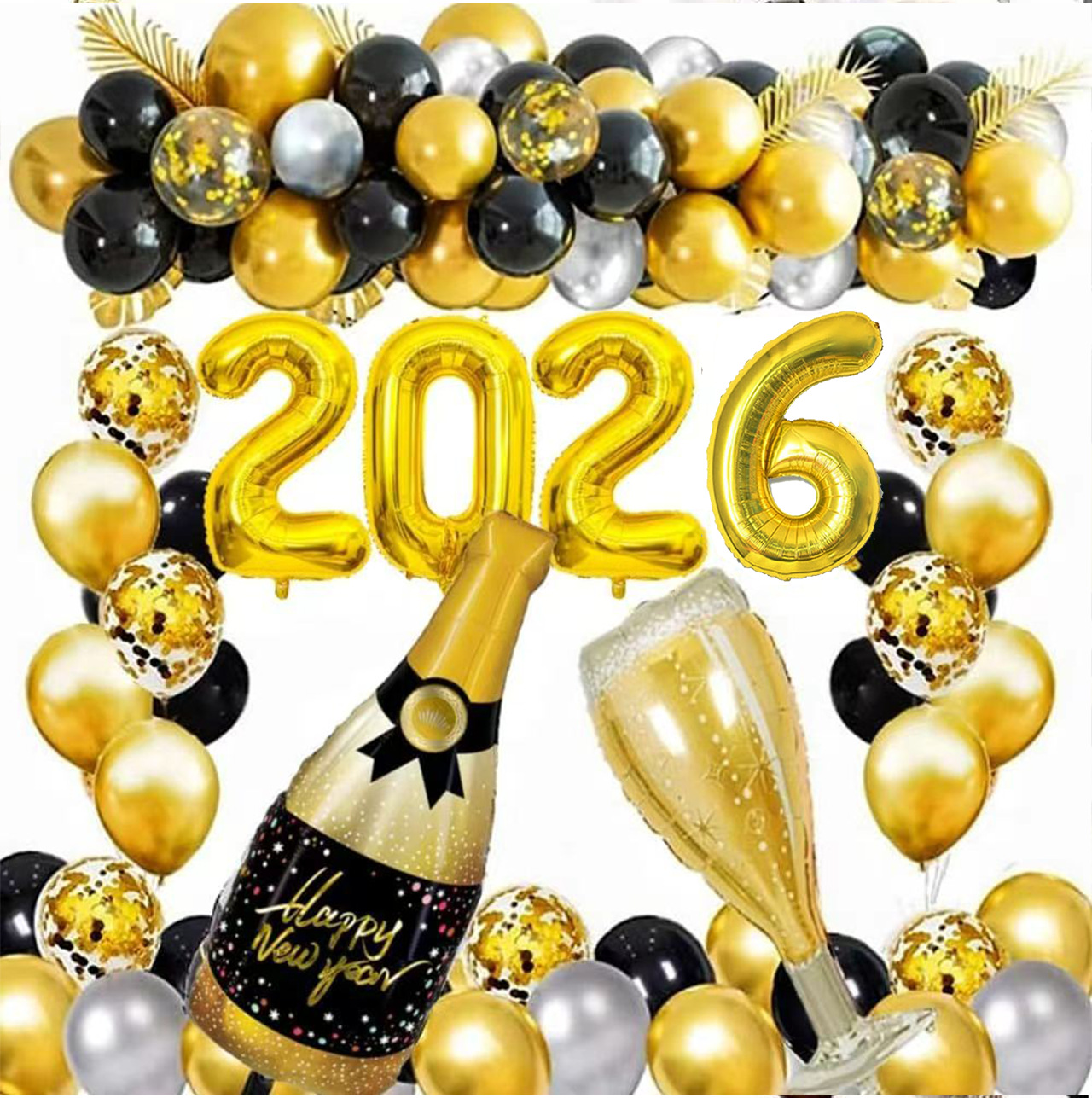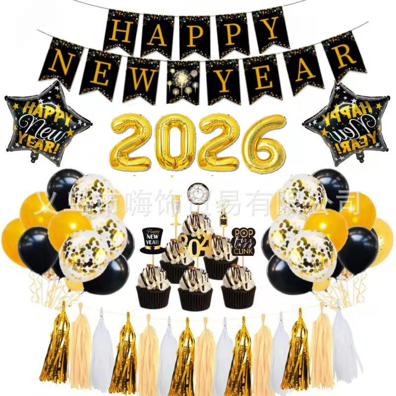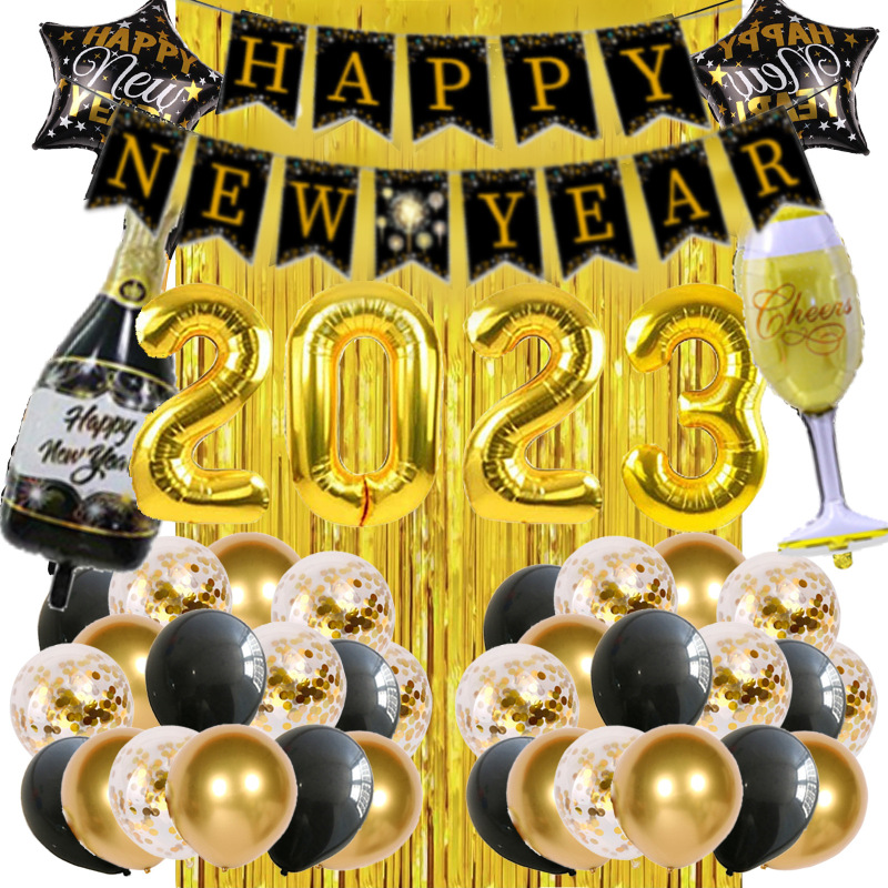 2024年新年テーマ黒金フラップ酒瓶ラウンドボールアルミ膜バルーン雨糸カーテン新年パーティーセット装飾