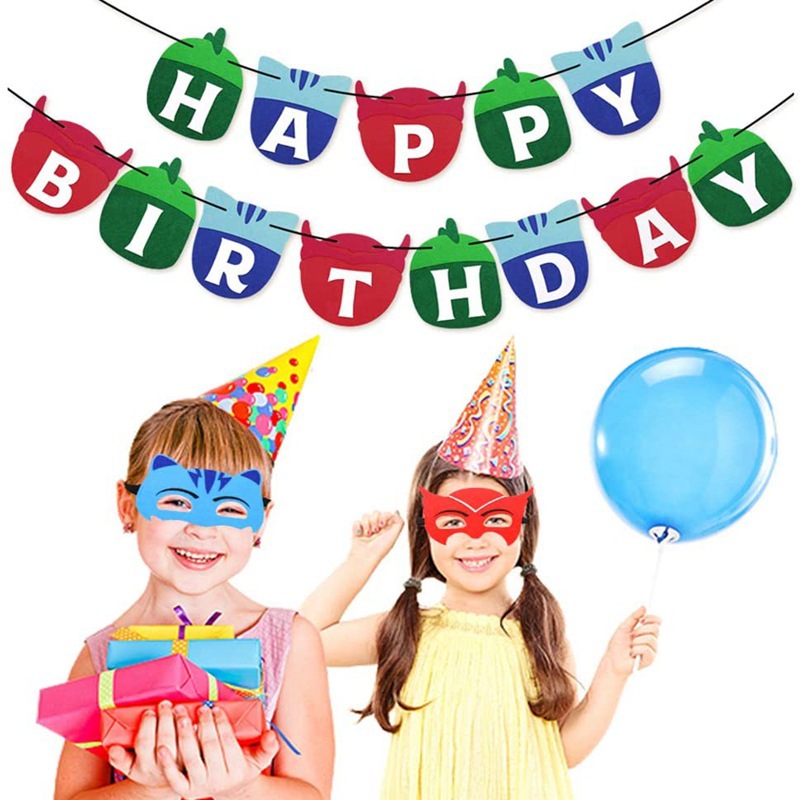 漫画のテーマカラーマスクのアルファベットの旗は子供の誕生日おめでとうございます。