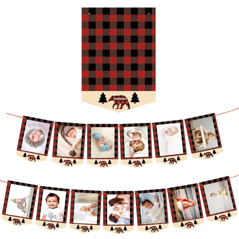 木こりの赤い格子のphioto bannerの赤ちゃんの歳の誕生日のパーティーの1-12ヶ月の写真は横断幕を挟みます。