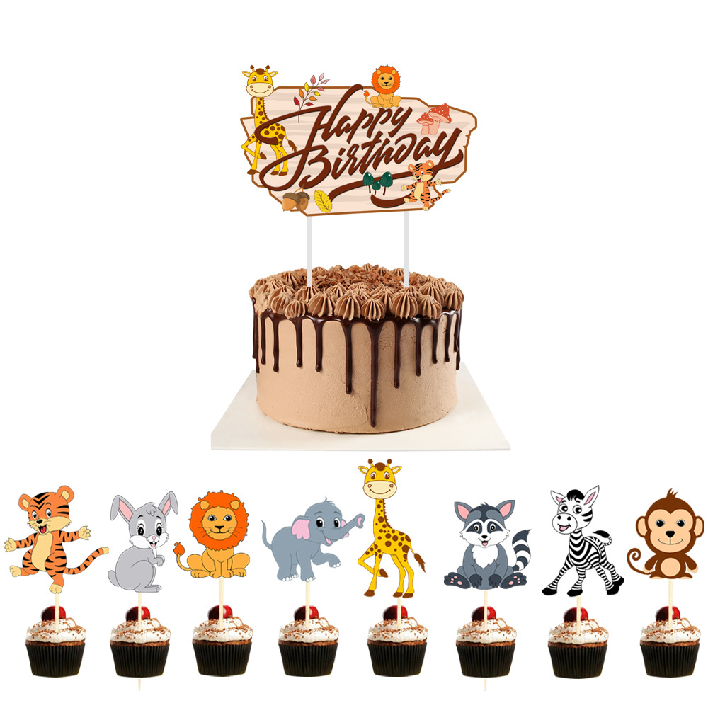 新しいジャングルの動物の誕生日は旗の漫画のライオンの象のケーキを引っ張ります。