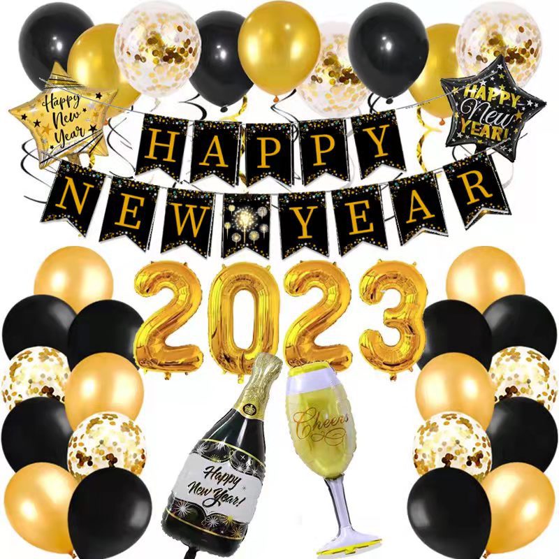2023年新年モチーフブラックゴールド新年フラッグボトルワイングラス32インチアルミフィルムバルーン新年パーティーセット