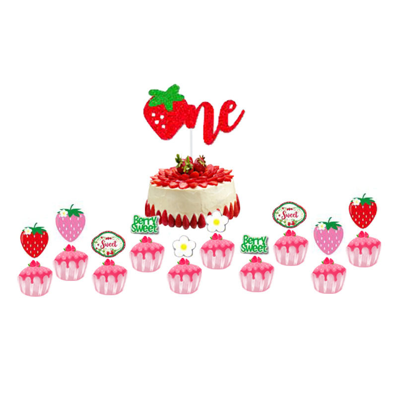 イチゴフルーツテーマのケーキインサート、子供の誕生日パーティーデコレーション、デザートテーブルフラッグ、スイート