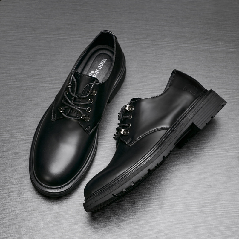 男性靴2024春の本革黒いビジネス靴の丸い頭の厚い底のファッションの工装の靴のひもの青年の通気性の靴