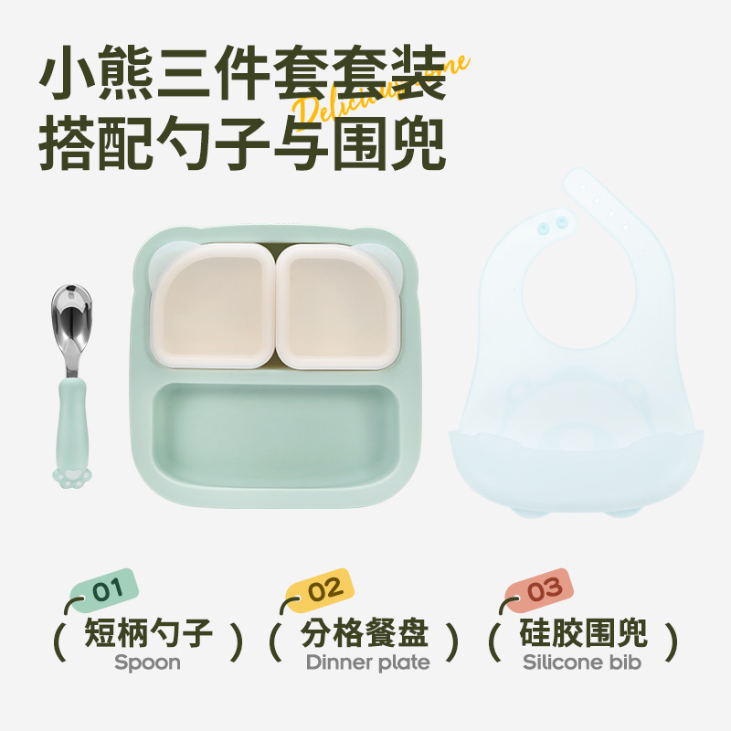 シリコンディナープレート3点セット、子供用食器、ディナープレート、よだれかけ、ベビーシリコンコンパートメントプレート、家庭用フードボウル、ディナープレート、スプーン