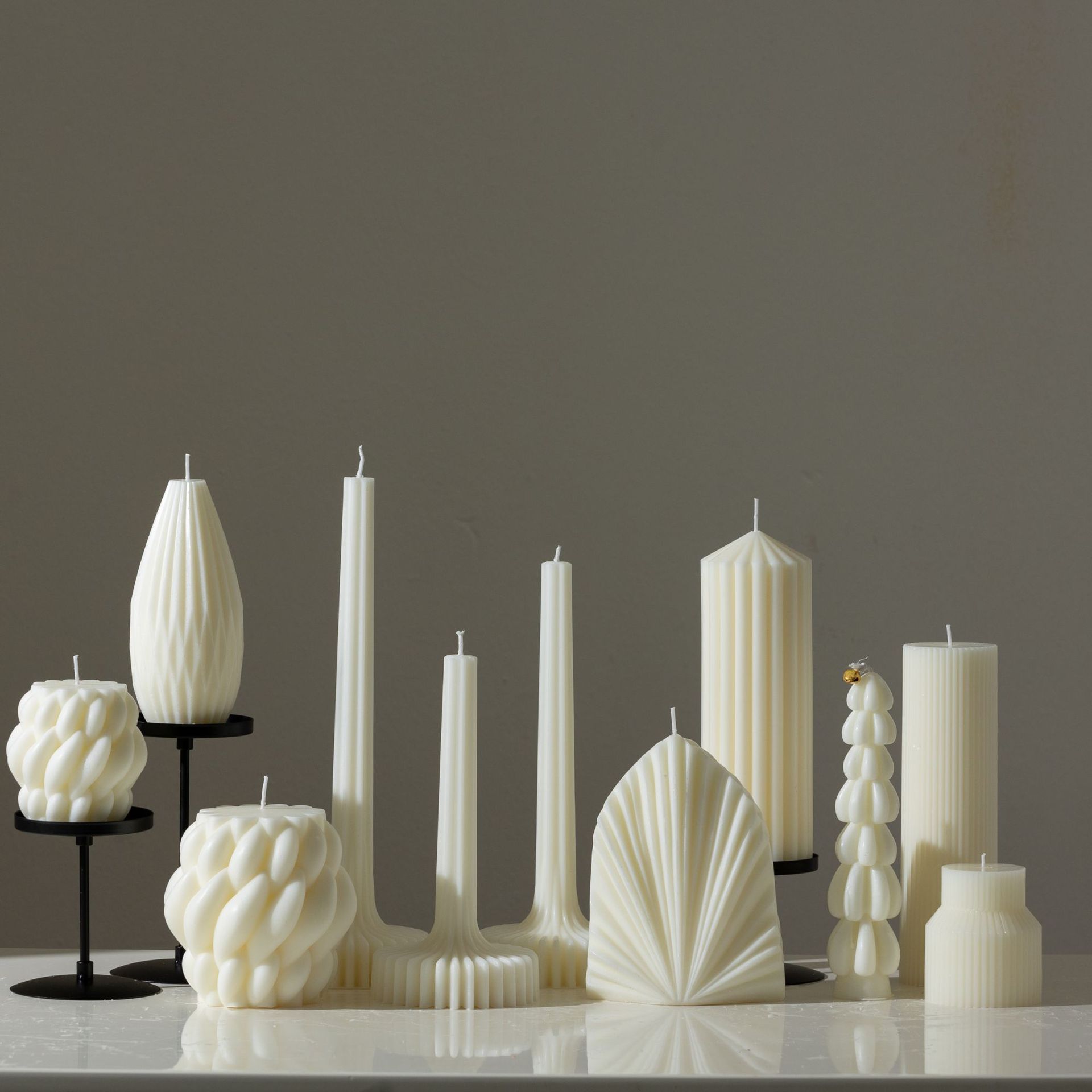 新しいアロマキャンドル工場は北欧の幾何学的な線の柱状の形の大きな白いアロマキャンドルを手作りでカスタマイズした