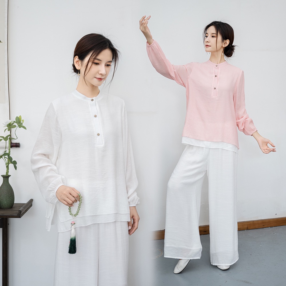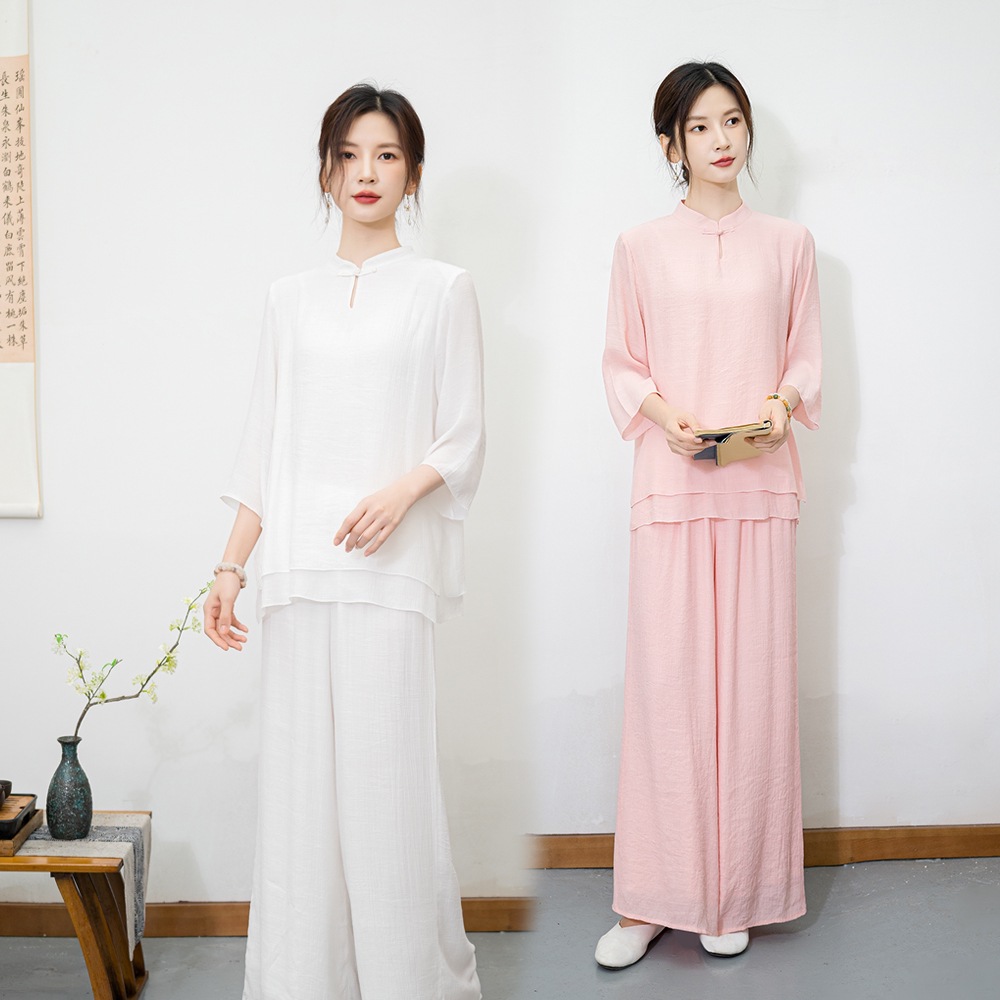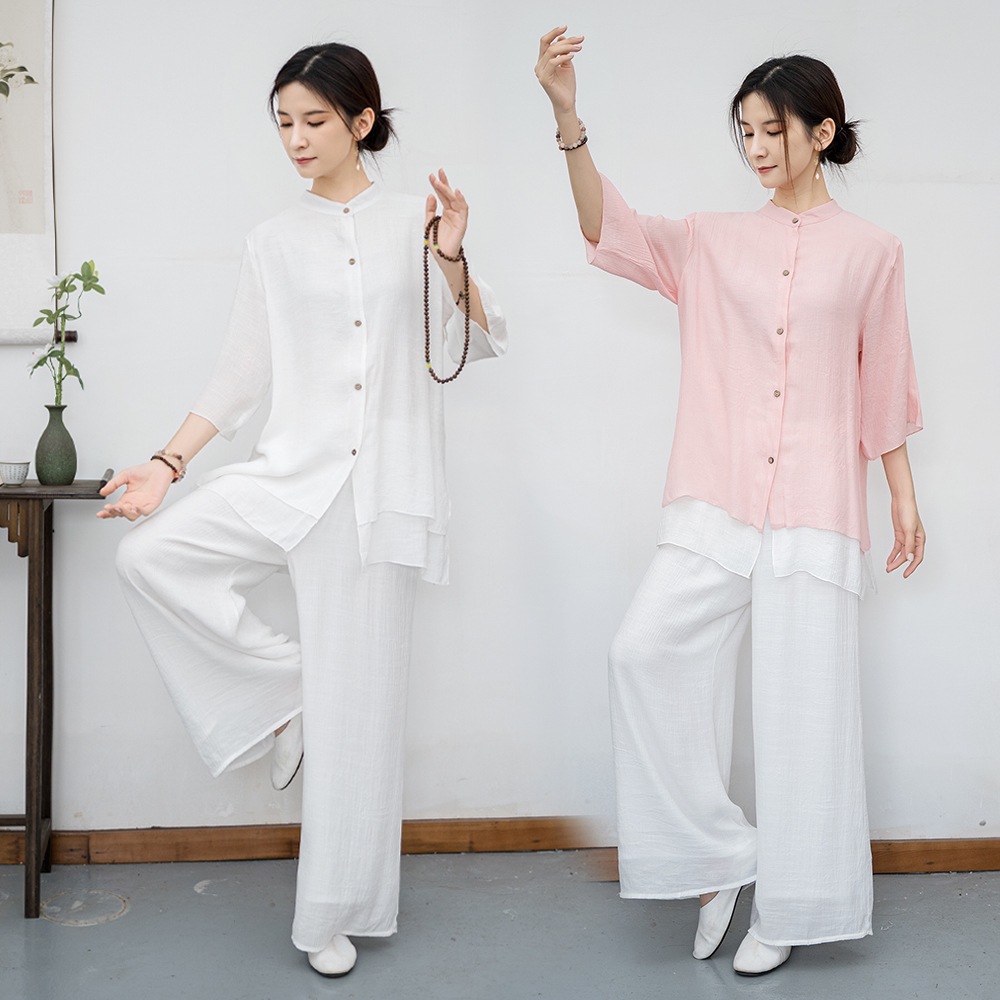 REAL SHOT # 2024 新エスニックスタイル綿とリネン禅瞑想スーツ中国風茶服パフォーマンススーツツーピースセット女性のための