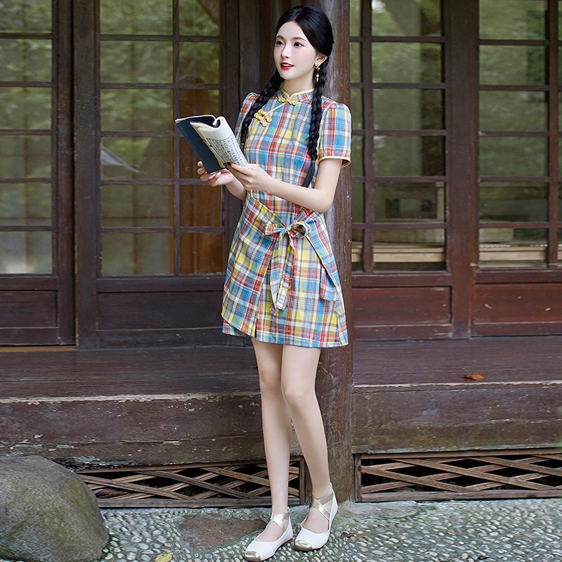 中国風のレトロなカラフルなチェック柄の若いスタイルの改良されたチャイナドレス少女文学淑女気質甘い新しい中国風のスカート