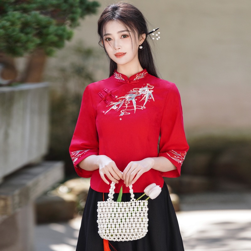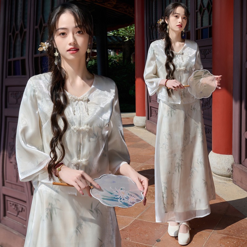 新しい中国風改良漢服スタンドカラーボタントップエスニック中国風学生クラス制服スカートスーツのリアルショット