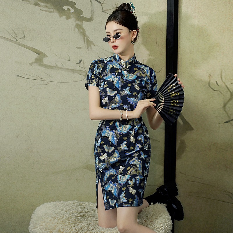 中国風の青い蝶の金プリントのスリムフィット改良されたチャイナドレス、レトロな文学的で芸術的な日常着の花柄ドレス