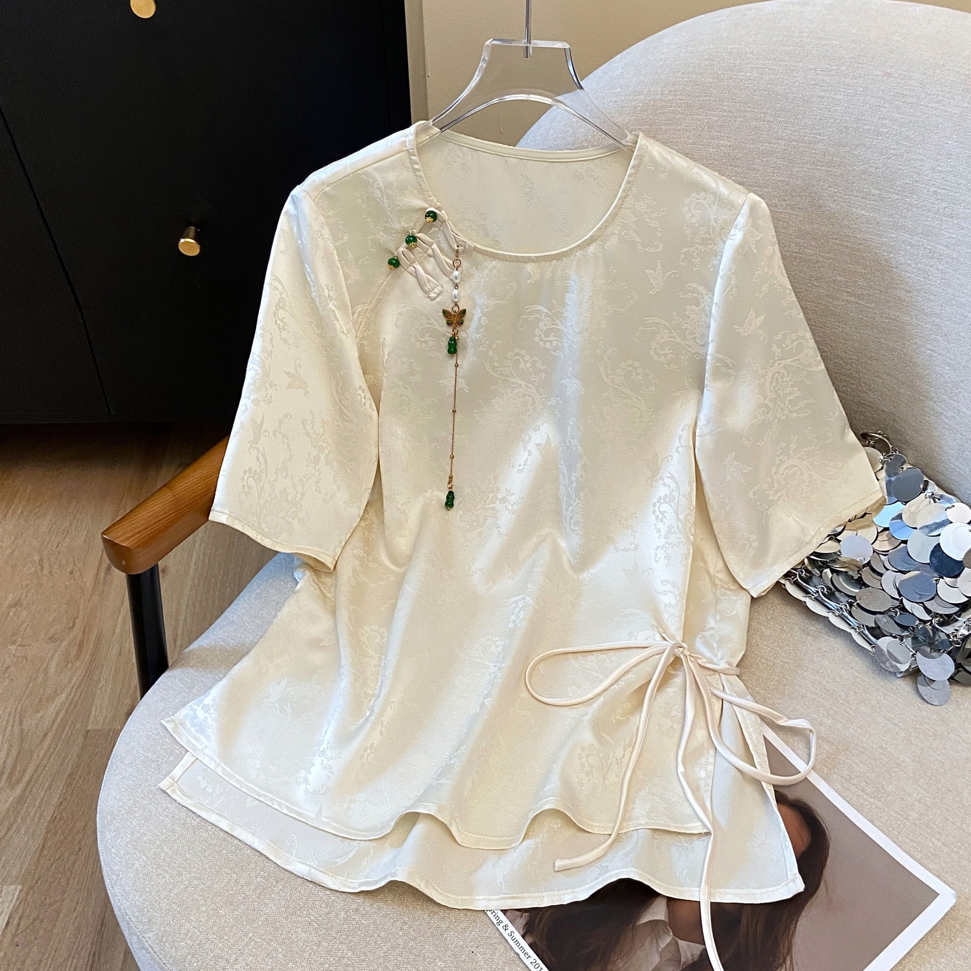 2025年新作夏の新しい中国風サテンジャカード気質シャツ中国風ハイエンドルーズトップのリアルショット