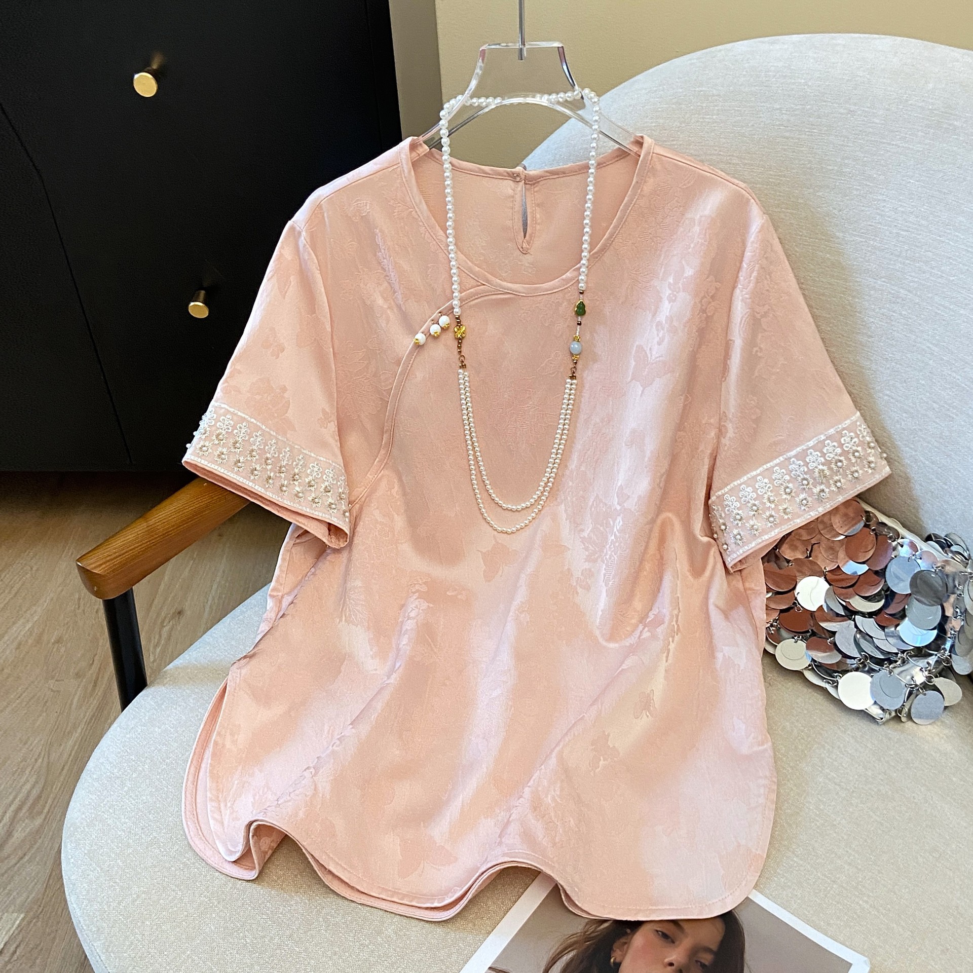 2025年新作夏の新しい中国風サテンジャカード優しい気質シャツ国民風大きいサイズカジュアルトップスの実物写真