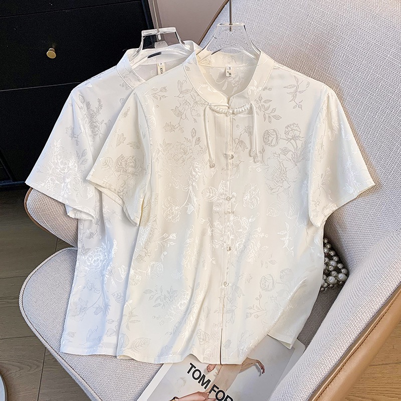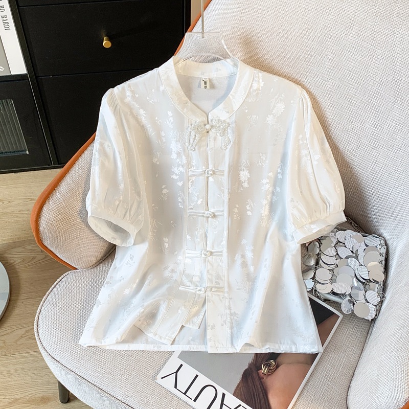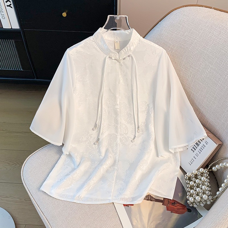 実写新中国式東風古韻ジャカード立襟盤ボタン民族風改良中袖国潮復古上着シャツ
