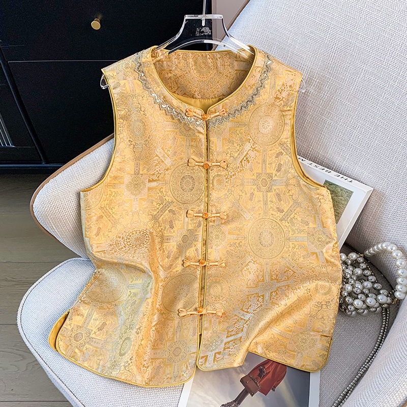 新しい中国風改良された国民的トレンドのボタン付き小さなラウンドネックジャカード錦織金重工業刺繍ベストトップジャケットのリアルショット