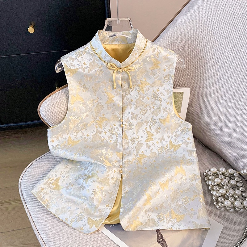 2025 春の新中国風のレトロな国民風スタンドカラーボタンフラワーテクスチャジャカードカーディガンベスト