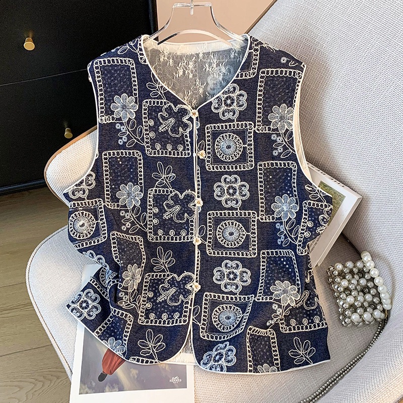 リアルショットの新しい中国風のレトロな小さなラウンドネックボタン付き中国風の重工業刺繍トップベストカーディガン女性用