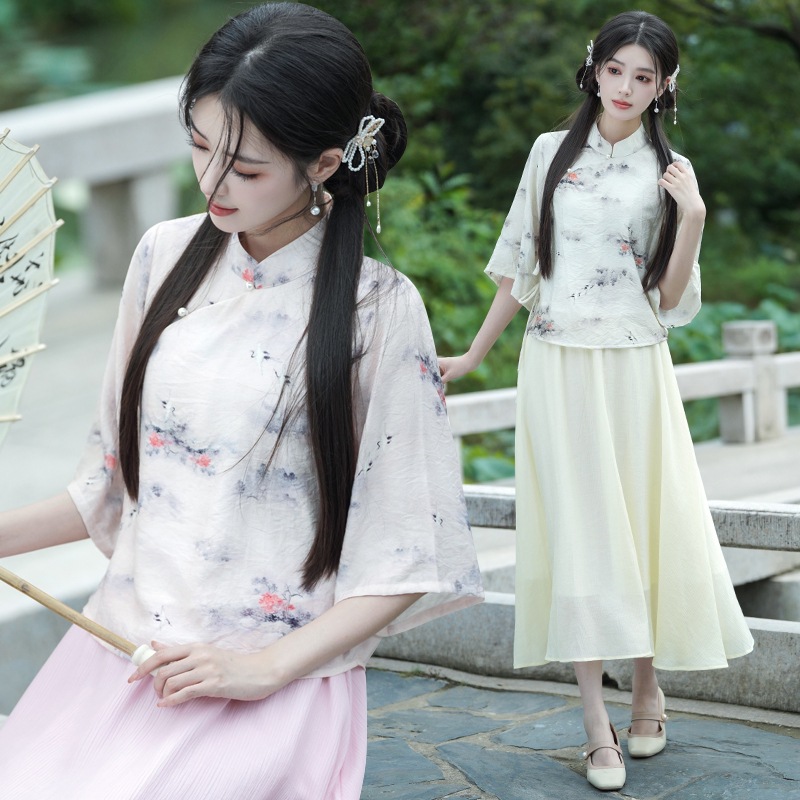 新しい中国風の漢服スタンドカラーステッチプリントボタンミッドスリーブトップと中国風改良スカートスーツのリアルショット