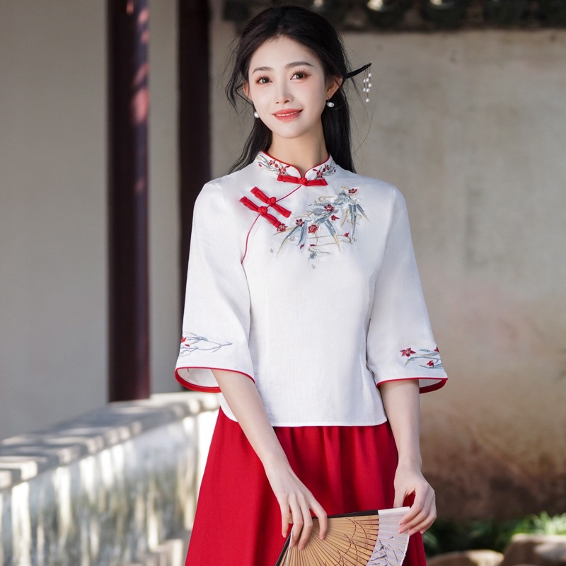 新しい中国風の刺繍婦人服のリアルショット、中国風の若いスタイルの改良された漢服スーツ、禅茶芸服トップス夏